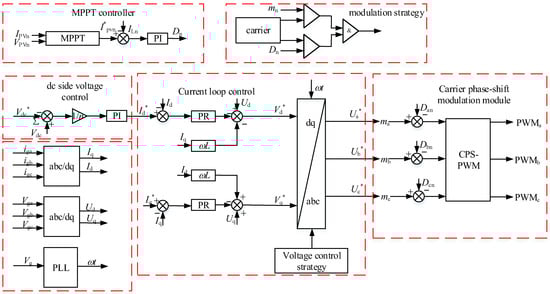 Figure 4 shows the control system diagram of a three-phase, boost-type CHB photovoltaic grid-connected inverter, comprising the MPPT module, DC total voltage control module, current loop control module based on the PR controller, phase-to-phase voltage control module, and carrier phase-shifted SPWM (CPS-SPWM).