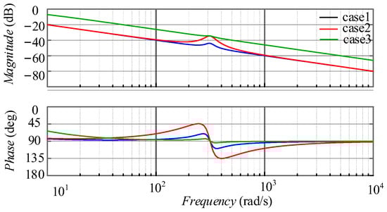 By substituting Equations (6) and (8) into Equation (7), the desired closed-loop transfer function can be derived. Subsequently, this function is used to generate the Bode plot illustrated in Figure 5. Figure 5 depicts the Bode plots of the current loop for three distinct parameter scenarios in the quasi-proportional resonant controller. In Case 1, both Kpc and Krc are set to 1. In Case 2, Kpc is maintained constant at 1, while Krc is increased to 5. In Case 3, Krc remains at 1, and Kpc is increased to 5. These cases are used to validate the impact of varying these parameters on the performance of the PR controller. Finally, the parameters of the PR controller are selected by example verification.