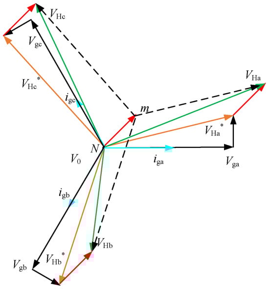 As shown in Figure 6, Vgn represents the grid phase voltage of phase n (n = a, b, c), ign denotes the grid phase current of phase n, VHn* signifies the inverter output voltage before adding the zero-sequence voltage, and VHn represents the inverter output voltage after adding the zero-sequence voltage. V0 denotes the added zero-sequence component. It is evident from Figure 6 that both the amplitude and phase of the inverter output voltage undergo changes upon the addition of the zero-sequence voltage. The voltage neutral point shifts from point N to point m.