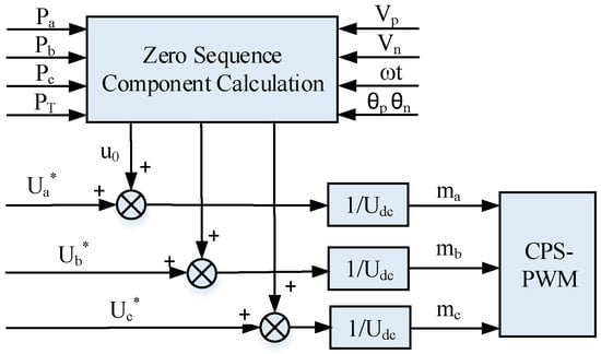 The block diagram of the interphase control featuring the incorporation of zero-sequence voltage is depicted in Figure 7. The system inputs encompass three-phase powers (Pa, Pb, Pc), total power (PT), positive and negative sequence voltages of the grid (Vp, Vn), phase angle (θp, θn), and the grid angular frequency. The zero-sequence voltage (u0) is derived from Equation (21) and is then incorporated into the modulation of the three-phase voltages. The resulting total signal participates in the final modulation step.