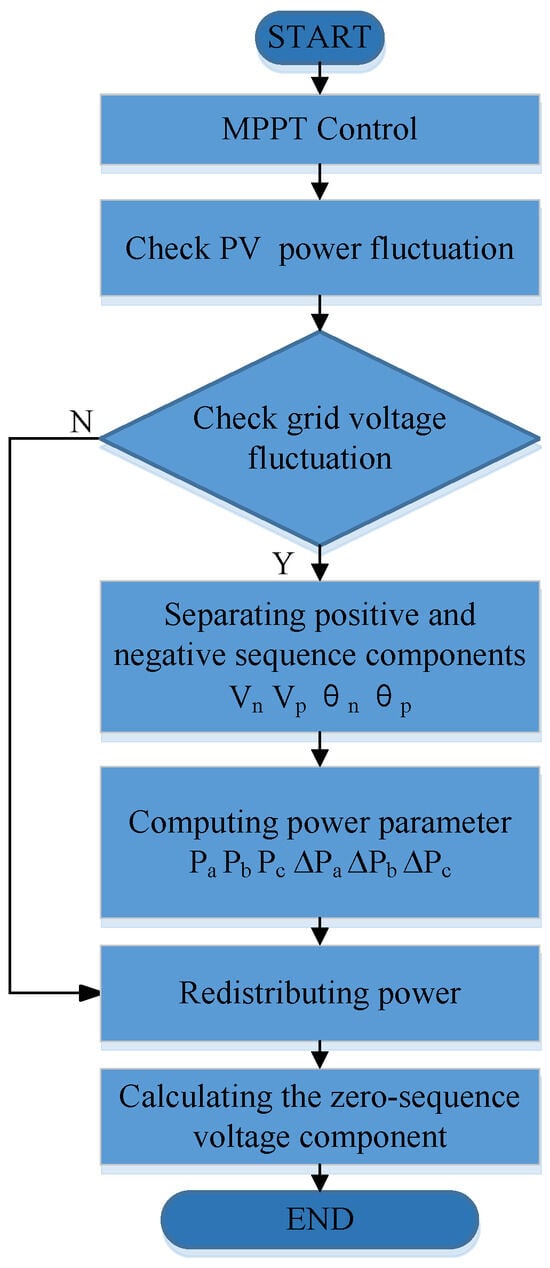 Based on the analysis conducted in the study, Figure 8 showcases the control strategy flowchart designed to tackle power balance challenges. Initially, the MPPT controller plays a pivotal role in detecting any deviations in the output power generated by the PV module. Subsequently, a comprehensive assessment of the grid’s condition ensues. In scenarios where the grid-side voltage remains stable, the system seamlessly adopts conventional power distribution and balance control measures, disregarding the positive and negative sequence components of the grid voltage. Conversely, upon detection of grid voltage fluctuations, the specialized control process outlined in Section 3.2 is promptly activated.