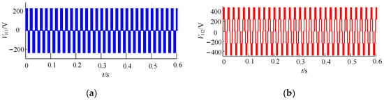 First, the inverter’s capability to boost voltage and regulate voltage levels was validated. According to the set parameters, the input voltage of the module is 120 V. When the modulation index (mp) exceeds 0.4, the inverter produces an enhanced five-level voltage output of up to 480 V. When the modulation index mp falls below 0.3, the inverter can output three-level voltage. Figure 9 shows the output voltage of the H-bridge in steady state. Specifically, Figure 9a depicts a three-level voltage output of 240 V from one H-bridge of the inverter, achieved with a modulation index of 0.2. Figure 9b shows a five-level voltage output with a maximum voltage of 480 V from one H-bridge when the modulation index is set to 1.
