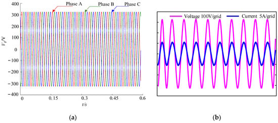 To validate the performance of the photovoltaic grid-connected system, waveforms of the grid side were captured from the simulation results, as depicted in Figure 10. Figure 10a illustrates the three-phase voltage on the grid-connected side, which corresponds to the set voltage of 220 V, and the output three-phase voltage is symmetrical with an optimal waveform. Figure 10b presents the voltage and current waveform of phase A, where it is evident that the voltage and current phases are aligned, resulting in a power factor of 1.