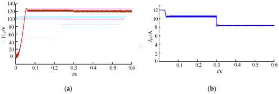 The simulations conducted have demonstrated the system’s superior performance under standard operating conditions. Next, the performance of the system when a power imbalance occurs will be examined through simulation tests. Figure 11 illustrates the output of the PV module when the light intensity suddenly drops from 1000 to 800 at 0.3 s. Figure 11a shows the output voltage at this moment. It can be observed that the output voltage stabilizes around 120 V at 0.05 s. At 0.3 s, a decrease in irradiance causes a brief fluctuation in the PV module’s output voltage, followed by stabilization at a slightly lower amplitude. Figure 11b depicts the waveform of the output current. Initially, it stabilizes at 10.5 A around 0.05 s. However, at 0.3 s, with a drop in irradiance, there is a brief fluctuation, followed by a decrease in amplitude, ultimately stabilizing at around 8.5 A. Therefore, when the irradiance decreases at 0.3 s, the PV module still works stably at maximum power, albeit not at its maximum capacity.