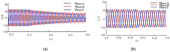 To simulate voltage fluctuations in the grid, a 10% reduction in the magnitude of phase B grid voltage was introduced at 0.3 s. Figure 12 depicts the grid-connected current waveform during this change in light intensity and grid voltage. Figure 12a illustrates the waveform without the addition of power balance control. It can be observed that when the irradiance decreases at 0.3 s, due to the simultaneous reduction of the phase B grid voltage, there is a slight increase in the phase B grid current. This results in sinusoidal distortion in the overall three-phase, grid-connected current, with a notable increase in imbalance and harmonic content, thereby increasing the degree of current distortion. Figure 12b shows the waveform of grid-connected current after applying control measures. Following the introduction of these measures, the grid current experiences a brief fluctuation at 0.3 s, subsequently returning to equilibrium. At this point, the three-phase currents regain symmetry, accompanied by a slight overall decrease in their amplitudes.