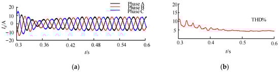To further validate the stability and robustness of the system, the system’s power imbalance was intentionally intensified, resulting in the waveform profiles presented in Figure 13. Specifically, Figure 13a illustrates the grid-side current under this condition, revealing that despite minor amplitude discrepancies, the three-phase currents remain largely symmetrical. However, waveform distortions and increase in harmonic content are present, indicating a deterioration in current quality. Figure 13b, detailing the harmonic spectrum of the currents, underscores this point by showing that at steady-state, the harmonic content has escalated to nearly 5%, approaching the tolerable threshold. In summary, although the system’s performance is slightly compromised when the power imbalance approaches its critical limit, it still retains the capability to maintain stable operation.
