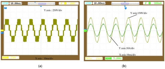 (a) The experimental waveform of H-bridge output voltage; (b) the experimental waveform of A-phase voltage and current on the power grid side.