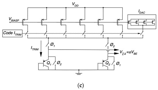 However, given the extensive required range, such techniques become complex and demand substantial chip area. Alternatively, in this work, the same six PMOS current sources utilized for generating the 1:5 current ratio are repurposed for generating the trimmed current. This is feasible because ∆VBE and VBE are never used simultaneously. Hence, five of these sources facilitate coarse trimming, controlled by the digital input, and the sixth current source enables fine trimming, by using the IDAC in Figure 4c. Such small 4-bit current DAC is employed to achieve a trimming resolution of 64 nA. With a total trimming range of 2–12 µA, with a 64 nA step, it adequately compensates for practical variations, and it is sufficient to reduce the mismatch to acceptable values. In the implementation, unused current sources are connected to an additional diode-connected transistor (not depicted in Figure 4), effectively limiting switching transients at their outputs.