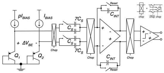 Six PMOS current sources, each nominally providing 2 µA, replicate the current generated in the bias circuit. Through a set of switches, each current is directed to either Q1 or Q2 (in Figure 4b). One of these switches is routed to one transistor, delivering the unit current in the 1:5 ratio, while the remaining currents are routed to the other transistor. The mismatch between the unit current source and the average of the other sources introduces errors in the resulting current ratio. By alternating the unit current source in successive modulator cycles, mismatch errors are averaged out. The integrator of the modulator performs the required averaging. The front-end also allows us to perform current trimming, in order to compensate for variations in the nominal value of the transistor’s saturation current and the spread of the bias current itself. Traditional trimming methods involve adjusting the emitter area or bias current using switchable binary-scaled transistors or bias current sources [].