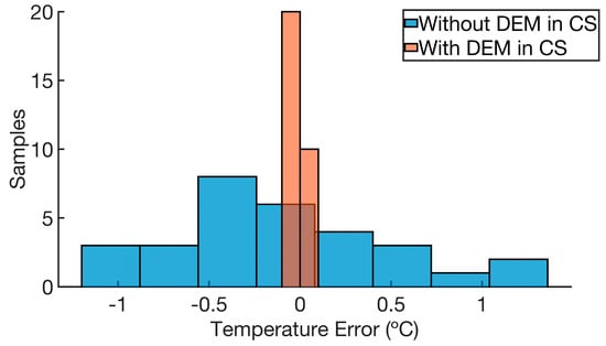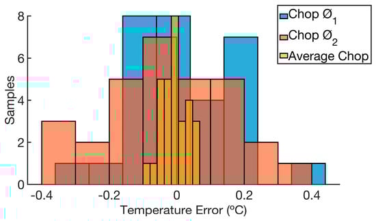 In order to quantify the benefits of chopping, two different MC experiments were performed as follows: A total of 30 MC samples with chopping active and 30 MC samples in chopping active were tested. In order to see the benefits of chopping, such temperature errors were then averaged. Figure 9 shows the results of such an experiment. It can be seen that the errors are large (>±0.4 °C) in both and , but the average error is subsequently reduced to less than 0.1 °C; hence, performing chopping does not have such a large impact as DEM but it is still important to achieve errors of around 0.1 °C. Table 2 shows a resumption of such simulations including maximum, minimum, average, and 3σ results of the temperature error in order to inspect the benefits of chopping.