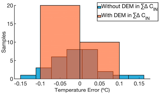 It can be concluded that applying DEM is critical for good accuracy. Especially in the case of the CSs biasing the BJT diodes (Figure 7), it can be seen that if DEM was not applied, then errors of more than 1 °C could be obtained. In this example, by applying DEM, the temperature error was reduced from more than 1 °C to less than 0.15 °C (in some samples). Hence, applying DEM on the CS of the front-end is key for achieving good accuracy. Regarding the case of the Σ∆ CIN, the results are not that critical but are still important to have a system accuracy with less than 0.1 °C error (see Figure 8). Table 1 shows a resumption of such simulations including maximum, minimum, average, and 3σ results of the temperature error.