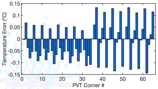 In this sub-section, the post-layout results are presented. In Figure 10 and Figure 11, it is possible to observe the temperature error for the same PVT (for pre-and post-layout respectively). It is possible to observe that the post-layout results do not differ much from the pre-layout since the layout respected all the necessary constraints in order to maintain accuracy. There is only one corner where the error increased from 0.13 °C to 0.25 °C; however, this is still a very acceptable temperature error. Apart from the corners, it was also important to study how the post-layout parasitics impacted the performance of the Σ∆ modulator. Hence, in order to observe this, several simulations were performed (34 temperature points) and its error was observed for each temperature point at the input and output of the modulator. The objective was to see if there was some degradation due to the Σ∆ modulator. The result of this simulation is shown in Figure 12, where it is possible to observe that there is almost no degradation from the input to the output of the Σ∆ modulator, which means that the post-layout parasitics of the Σ∆ modulator do not impact the performance of the temperature sensor.