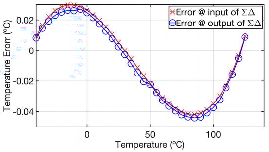 Temperature error versus temperature (error at the input of the sigma–delta and error at the output of the sigma–delta).