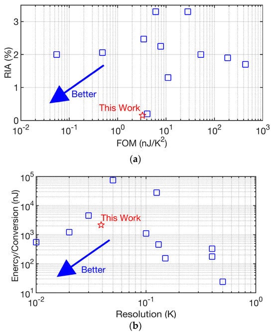 Comparisons against the state-of-the-art sensor. The squares are other works, and the star is the temperature sensor presented in this work. (a) FOM vs. RIA and (b) Resolution vs. Energy/Conversion performances.