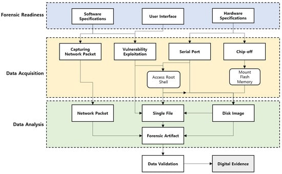 Figure 1. The proposed methodology consists of four steps: forensic readiness, data acquisition, data analysis, and data validation. Forensic readiness identifies devices in the environment and the SW/HW in the device before forensic analysis. After identifying elements in the environment, we derive which methodology to apply according to the software/hardware and extract data through real devices. The extracted data include a dump image, a packet, etc., according to the applied acquisition method, and the data are analyzed from a forensic perspective. The artifacts derived in this way can be used as evidence in actual investigations through verification.