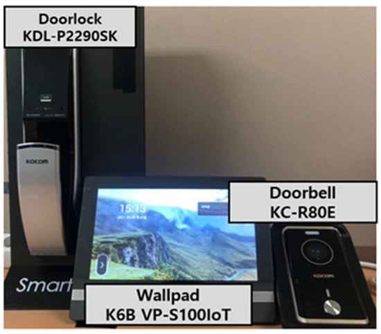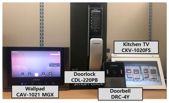 The COMMAX testbed consists of a wallpad, a doorbell, a door lock, and a kitchen television phone, while the Kocom testbed consists of a wallpad, a doorbell, and a door lock. Both testbeds provide services centered on the wallpad. The Kocom and Commax wallpads support Wi-Fi like Samsung, and the OS was identified as Android version 4.2.2. Also, there is a pin presumed to be a UART port in both wallpads, as well as a 4 GB NAND flash.