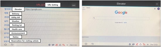 For the Samsung testbed, the doorbell, door lock, and sensor are interlocked with the wallpad as the center. Upon investigating the software and hardware specifications of interlocking devices except for the wallpad, no software specifications, connection interfaces, or memory chips were found for data acquisition. However, for the wallpad, it was confirmed that it supports Wi-Fi and uses the Android version 4.2.2 for the OS through network packet sniffing. This Android version is an older version and has the potential to exploit known vulnerabilities to obtain data. By function identification of the UI operation of the wallpad, it was also confirmed that the video and voice memo recorded from the doorbell are stored in the wallpad. In addition, it was confirmed that it is possible to enter the hidden administrator settings by entering ‘#*00’ in the ‘Password’ menu of ‘Settings’, where a password can be set to unlock the security function. The number to enter to gain access to the hidden administrator setting was confirmed by inquiring the device vendor. In the hidden administrator setting, various menus provide the wallpad function, and it was identified that, in some cases, the functions were provided by access through a Uniform Resource Locator (URL). If the user changes this URL, instead of providing the function, the user can access the website of the changed URL. In this process, if you access a website with functions such as a file attachment, such as mail, you can check the Android UI for the file attachment, and there is a possibility that you can extract files by using this. These hidden functions can act as weaknesses of the device.