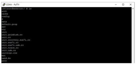 Figure 10. With a PC, the root shell of the wallpad can be accessed using PuTTY. The connected shell is assumed to be the Android Debug Bridge (ADB), and the possibility of a memory dump can be explored. For the Samsung wallpad, the UART pin was identified through the energization test among the 15-pin debug ports, but the data input/output could not be confirmed. The COMMAX wallpad identified the UART pin, and PC connection was performed using PuTTY like