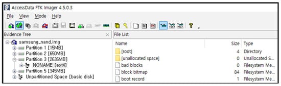 When a disk dump image is acquired, a single file stored in the image is extracted through file system identification and analysis. Each smart home IoT device can use a variety of OSs, and the file systems used can also partially differ. Therefore, to perform data analysis to enable the use of the data stored in the acquired disk dump image as key evidence in the investigation, the file system must be identified, and the file must be extracted in a manner suitable for each file system. In some cases, deleted files can be recovered through image analysis and forensic tools, such as The Sleuth Kit (TSK), encase, and Forensic Toolkit (FTK) imager.