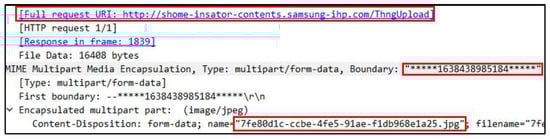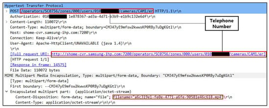 User data stored in the cloud server can be inferred through the analysis of the captured packets. This may be helpful in the subsequent review of warrant issuance. In addition, if a replay attack using a session token and a web proxy is possible, user data stored in the cloud can be directly extracted. Additional vulnerabilities can be derived using information such as URLs. In the case of the Samsung wallpad, most of the communication between the cloud and the device is accomplished through Hypertext Transfer Protocol (HTTP). When a crime prevention notification occurs through the sensor, a video is recorded by the camera mounted in the wallpad. When the packet corresponding to this situation is captured, the user ID of the linked smartphone app can be confirmed. In general, the ID of the smartphone app that works with the Samsung wallpad is set to the user’s phone number like