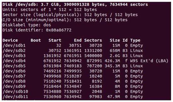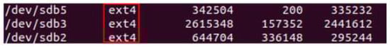 Figure 17, a total of 11 partitions were output, where ‘/dev/sdc4’ represents Partitions 5 through 11. The existence of 10 partitions was confirmed. Three of the partitions used the Ext4 file system as shown in