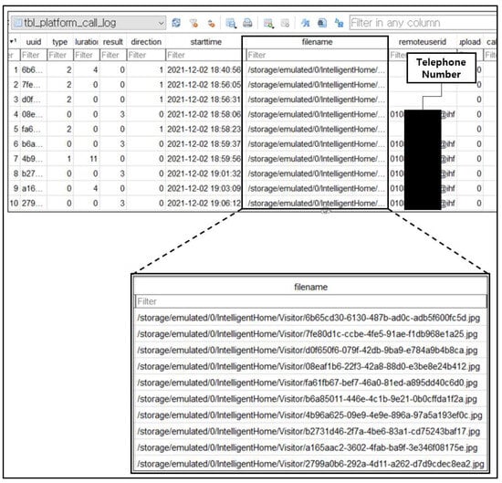 Figure 19. When a network camera is triggered, the visitor image is saved, and the device (wallpad/smartphone) processes the notification, including the visitor thumbnail path and visit time, which can be identified through the values stored in the table. The stored location of the visitor thumbnail file can be checked through the table filename and the visit time through starttime and visittime.