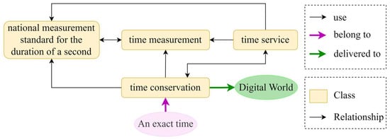 - Defining hierarchy relationships between classes. To adapt the OTMV to the requirements of digital transformation, this paper proposes a classification principle that meets the intrinsic requirements of time transfer in the digital world for the division of parent classes, and a combination of top-down and bottom-up methods for the division of subclasses. Based on the knowledge content determined in the first step, the important terms are listed and which terms will be used as classes is determined, and then, the hierarchical relationship of these terms is further divided to establish a hierarchical structure.