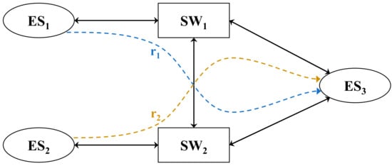 The architecture model, which abstractly represents the physical connections of the network, can be modeled as a directed graph and includes end systems (ES), switches (SW), and links. Here, (vertices) refers to the devices constituting the network, which are ES and SW, and is defined as . (edges) represents the physical data links, where a link connecting to for can be represented as . Each edge has three attributes: transmission rate, propagation delay, and queue number. The transmission rate, denoted by , represents the number of bits transmitted per second over the link. The propagation delay, denoted as , refers to the time required for an electrical signal to travel from the source to the destination through the physical medium. Finally, the queue number represents the number of queues present at the egress port, with the TSN standard allowing up to eight queues per egress port. The n-th queue of the egress port is represented by . Figure 1 illustrates a network topology comprising three ES and two SW. The transmission path (route) of the traffic is denoted by , which is a list of edges traversed by the traffic from the source to the destination in order. In Figure 1, for , the source is ES1, and the destination is ES3, and it can be represented as a sequence of edges: .