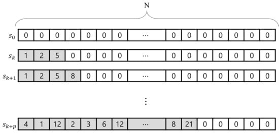 In a TSN, finding the optimal schedule involves determining the transmission order of STs that maximizes the quality of service (QoS) of the network. Therefore, the TSN scheduling problem can be defined as a sequential decision-making problem. In this study, we define the scheduling problem as an MDP and apply reinforcement learning. First, the state is defined as the current arrangement of frames in a list, where N denotes the number of frames transmitted during the hyperperiod. An action is defined as the act of selecting a frame and placing it on a list. Figure 2 shows an example of the state space in which the scheduling problem is defined as an MDP. The initial state comprises N empty slots with no selected frames, and the state is determined by the selected frames and their order.