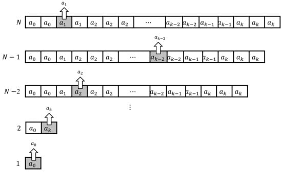 Figure 3 illustrates the changes in the action space based on the action selection when the scheduling problem is defined as an MDP. Here, N represents the number of frames transmitted during the hyperperiod, as defined in the state space. The initial action space has a size corresponding to the arrangement of frames in a list. As actions are selected from the action space, their size decreases by one with each action, and the learning agent completes an episode by selecting N actions. This approach prevents the reselection of already placed frames, ensuring the completion of a full episode. For instance, in the case of in Figure 3, a maximum of two can be selected, and reducing the action space prevents exceeding the maximum selection count (where k denotes the flow type).