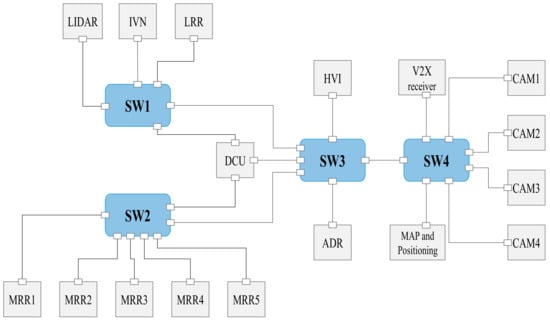 To evaluate the performance of the schedule generated by the machine learning (ML)-based optimization algorithm, a network for the autonomous driving system of a large vehicle, such as a bus, was considered. As shown in Figure 4, the network was configured with 17 end stations and four SWs [26]. All links constituting the network were set to a 100 Mbps Ethernet full-duplex, and the information related to the 27 flows transmitted over the network was configured as summarized in Table 1. The experimental environment for performance evaluation is based on the autonomous hydrogen bus project conducted with H Company in Korea and is designed with a structure for autonomous driving, including four cameras, five radars, DCU, V2X, HVI, and ADR. Here, the IVN sensor refers to a module that converts CAN messages generated from vehicle parts into Ethernet messages and acts as a gateway for communication between sensors with different protocols.