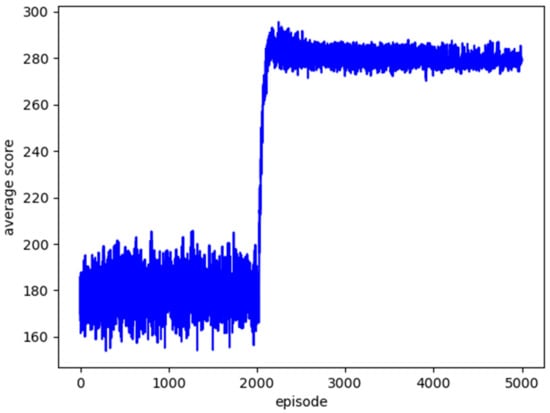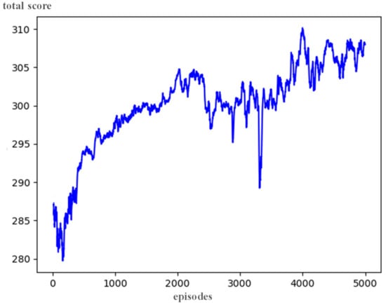 Figure 5 shows the total reward obtained in each episode over 5000 training iterations. With the application of the DQN, the total reward converged at approximately 5000 episodes. The observed variance around a specific value is a result of exploration owing to the ε-greedy policy. To evaluate the performance of the DQN-based schedule, the episode with the highest total reward among 5000 episodes was selected. The total reward for the selected episode was 295.55 points. Using the results of this episode, a schedule was generated, and three performance metrics were calculated. Table 2 lists the three performance metrics obtained from DQN and their normalized values. After the exploration phase for storing datasets in the replay memory, the highest total reward was achieved within approximately 2000 episodes. It took approximately 8 h to complete all 5000 episodes.