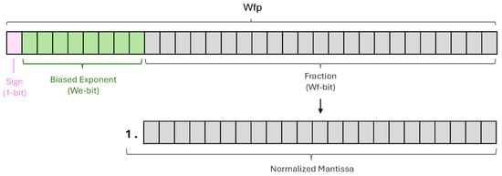 where s indicates the sign of the number, with 0 representing positive and 1 representing negative, e is the exponent, typically stored in a biased form, which scales the number by a power of two, allowing for a wide range of values, and m is the normalized mantissa . The mantissa represents the significant digits of the number, providing the necessary precision. Figure 1 illustrates the binary floating-point representation, where a number is given on Wfp bits. The sign bit occupies one bit, the biased exponent occupies We bits, and the fraction occupies Wf bits, making .