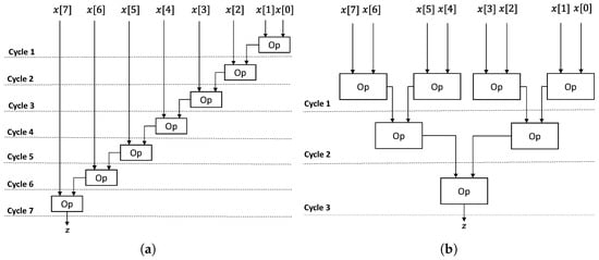 A key aspect of developing generic vector summation is its ability to accumulate a variable set of customized floating-point numbers. Given that the input array can vary in size, we needed loops or similar constructs to perform essential sub-functions such as determining the maximum exponent (line 9) or summing the mantissas (line 18). A straightforward approach is to use loops with unrolling directives. However, the Vivado HLS tool typically creates an unbalanced tree structure for array-reduction operations like an accumulator when unrolling the corresponding loops. Figure 4 illustrates the difference between unbalanced and balanced tree hierarchies for executing array-reduced operations on an 8-sized array. Both consume 7 binary operators but in different cycles, resulting in the unbalanced version having a longer critical path and inefficient performance. Although there is a directive (unsafe_math_optimizations) [34] to balance match expressions under certain conditions, we designed a template-based recursive function structure to reduce reliance on tool features and ensure the operations are consistently optimized.