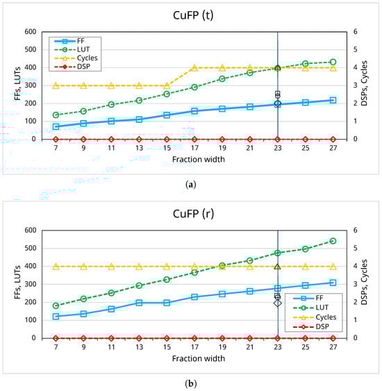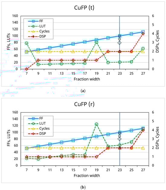 Figure 6 reveals a notable peak in LUT utilization just before an increase in DSP usage, which is attributed to the oversizing of DSP operands during mantissa multiplication. Given that the input size of DSPs in the Virtex Ultrascale+ family is 18 × 27 [13], managing transitions beyond 18 fraction bits challenges the HLS tool in efficiently allocating logic. During these transitions, the tool initially allocates extra LUTs for fraction multiplication. As the fraction width increases further, it shifts to additional DSPs to handle larger inputs, normalizing LUT utilization. This demonstrates the HLS tool’s balance between LUT and DSP allocation to optimize resource use for the mul operation in CuFP.