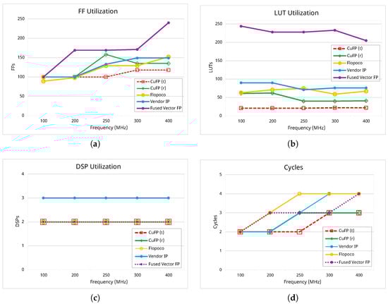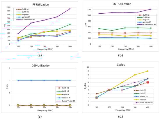 Comparing the resource utilization of sum operation for CuFP (8, 23), Flopoco, Fused Vector FP [32], and vendor IP as the target clock constraint is swept from 100 to 400 MHz; (a) FF Utilization; (b) LUT Utilization; (c) DSP Utilization; (d) Number of clock cycles.