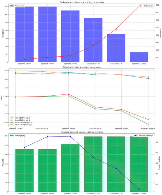 For the connection given at the level of controlled measurements in dynamic environments, we have channeled our attention to the LoRa connection to highlight the reliability, consumption, and robustness, but also the low costs compared to other technologies. Table 3 shows the practical parameters and data used in the implementation of the LoRa 2.4 GHz communication prototype. These are essential for evaluating system performance under real-world conditions. The power of the transmitted signal (Pt) is 14 dBm. This is the effective signal strength emitted by the transmitter. The transmitter antenna gain (Gt) is 2 dBi. This measures how effectively the antenna directs the emitted power. The antenna gain of the receiver (Gr) is 8 dBi, indicating the efficiency of the antenna in receiving the signal. The distance (d) between transmitter and receiver is 500 m, and the signal must cover this distance.