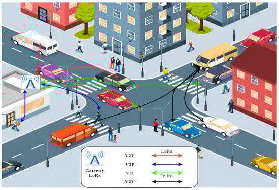 The efficient integration of these units ensures a continuous and reliable flow of information between the environmental sensors and the central data collection points, thus facilitating real-time monitoring and management of various parameters. LoRa technology, with its advantages of low power consumption and long-distance transmission capability, is ideal for IoT applications in urban and rural environments, where wide coverage and long battery life of the LoRA devices is essential. Figure 5 shows the interconnectivity offered by LoRa for the other types of communication protocols, such as V2V, V2I, and V2P, and how LoRa re-realizes these procedures for road and pedestrian infrastructures.