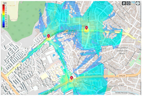 We can say that these calculations expose the way in which the performance of the proposed LoRa network has been evaluated, highlighting different conditions or settings, as this aspect is also based on an analysis for performance optimization and ensuring stable communication between vehicular applications and their connection to ITS systems. In the context of developing sensor networks for smart city applications, analyzing the propagation of radio signals is essential to ensure optimal coverage and high performance. In this chapter, we present the use of a ray tracing model to evaluate the propagation of LoRa signals at 2.4 GHz frequency in a complex urban area. This approach is comparable to previous evaluations carried out for DSRC and C-V2X technologies, providing a comprehensive insight into the efficiency of vehicular communication networks. The modeling of radio signal propagation was performed by a 3D simulation using ray tracing techniques [58]. These techniques allow detailed analysis of signal interaction with obstacles in the environment, such as buildings, vegetation, and other urban structures. The simulation was carried out on a digital map of an urban area, providing a realistic context for evaluating the performance of the LoRa network. Similarly, simulations for DSRC and C-V2X involved detailed analysis of signal reflections and refractions in densely built urban environments (see Figure 6).