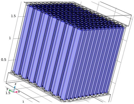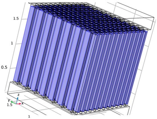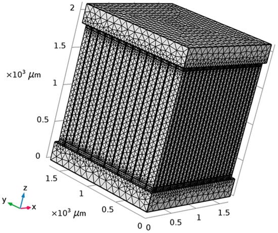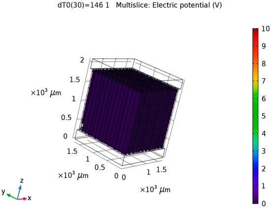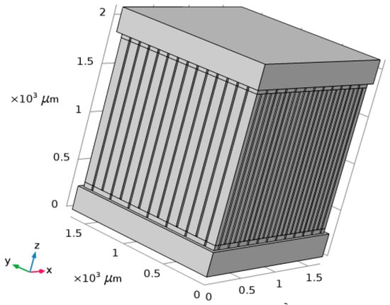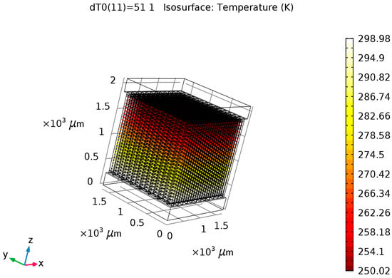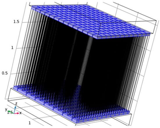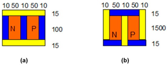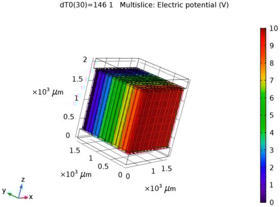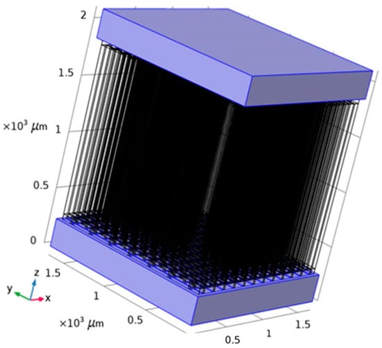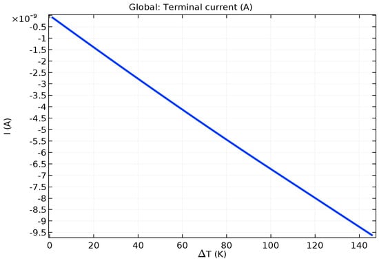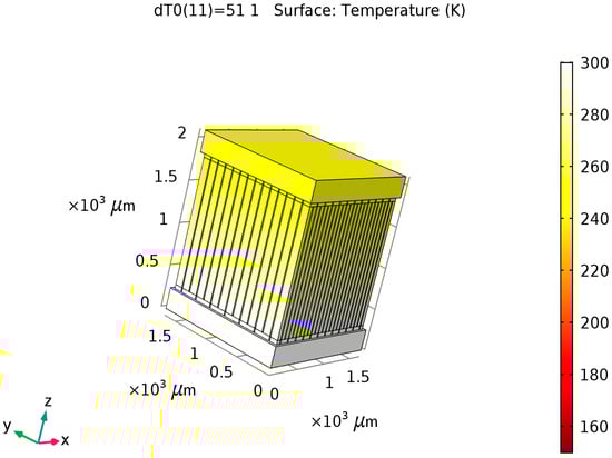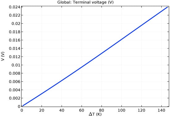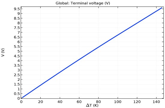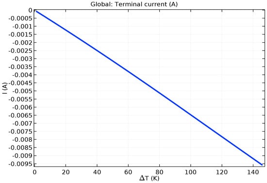 The Seebeck Coefficient of the raised structures is purely a function of their chemical composition, not their geometry or dimensions. Bismuth Telluride (Bi2Te3) is the best, well-known thermoelectric compound for low-temperature applications []. The biggest issue in the circuit design is the role of series resistance in each one of the 169 junction (13 × 13) series-connected arrays. The length and width of the circuit pathways are determined by the geometry of the layout. The degree of miniaturization causes these pathways to be long and narrow. Maximizing the cross-sectional area of the circuit pathways through increased depth or thickness will combat this issue to maximize the current delivery capability of each of these arrays. Placing 169 of these arrays in parallel to each other should deliver a significant current, as the mathematical model for this system will show.