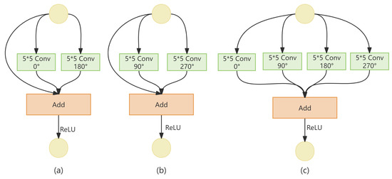 Rotational convolution ingeniously modifies the depthwise convolution approach by utilizing convolutional filters, which are uniformly sized but strategically rotated to different orientations (0°, 90°, 180°, 270°), as delineated in Equations (3) and (4). Each convolutional kernel shares identical parameters, yet their positioning varies according to the angle of rotation, enhancing the model’s capability to capture features from multiple orientations with a consistent parameter set. This methodology not only amplifies the receptive field pertinent to feature extraction but also optimizes the exploitation of IVE resources. Furthermore, it effectuates a substantial reduction in the convolutional filter parameters, diminishing them to a mere quarter of those necessitated by conventional convolutional approaches. The architectural configuration of this novel convolution unit is delineated in Figure 1. In the figure, (a) and (b) show two rotational convolution kernels with shortcuts, and (c) displays the full rotational convolution architecture. The next section will provide a detailed comparison of these structures through ablation studies.