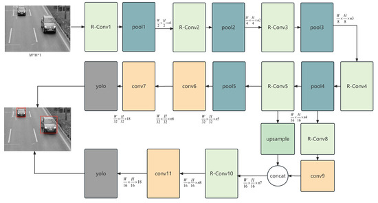 In the domain of security surveillance applications, the foremost application lies in object detection, with a particular emphasis on the detection of pedestrians and vehicles. The network described in this paper is also applicable to object detection tasks. Building on the network architecture discussed in the previous section, modifications are made to the YOLOv3-tiny [24] network to train models for the detection of vehicles and pedestrians. The architecture of the network is illustrated in Figure 2.