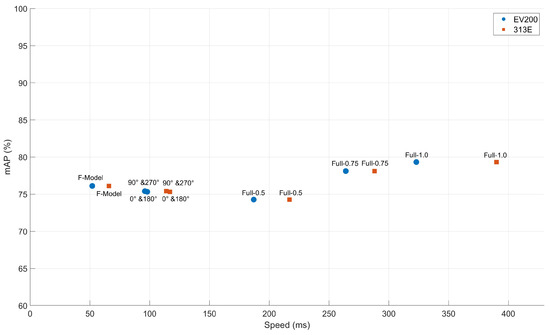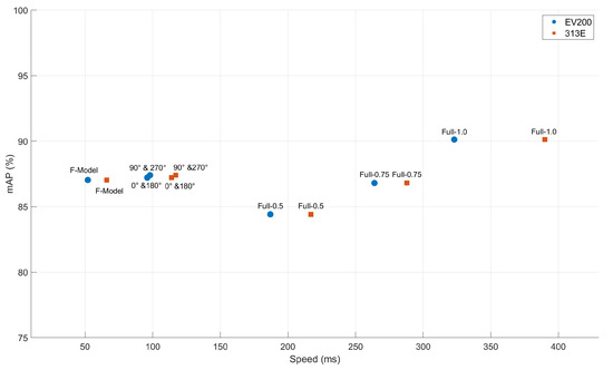 As shown in Figure 5 and Figure 6, The “Final Model” denotes the completed version of the detection model, whereas “Full-1.0”, “Full-0.75”, and “Full-0.5” indicate the employment of the recognition backbone network at different scaling factors. Similar to the preceding section, configurations “0 and 180” and “90 and 270” incorporate only selected rotational convolutions. An examination of the test results reveals that the Final Model achieves enhanced performance in both pedestrian and vehicle detection scenarios. Although the alternative backbone networks also exhibit strong performance capabilities, they are characterized by longer execution times, suggesting their potential utility as backbones in future, more complex object detection frameworks.