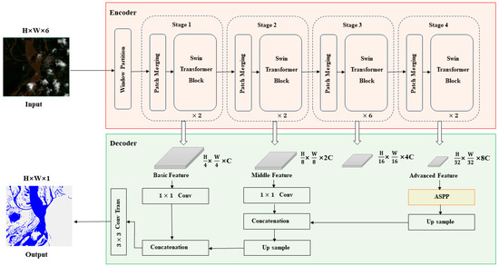 The Transformer, initially proposed for natural language processing (NLP), distinguishes itself from CNNs in feature extraction through the utilization of self-attention [32]. Additionally, the Transformer exhibits robust capabilities in modeling global information relationships. Nonetheless, it faces challenges related to high computational complexity when processing long sequence inputs. In 2021, the Swin Transformer was introduced to mitigate the issues associated with large-scale visual entities and computational complexity. This technology has demonstrated significant potential in addressing various visual tasks, including image classification, object detection, and semantic segmentation. In this investigation, the Swin Transformer is utilized to enhance the representation of water features at different scales and to establish comprehensive global contextual information for precise delineation of water boundaries. The architecture of the network for surface water mapping, which employs the Swin Transformer for feature extraction, is depicted in Figure 3, utilizing an encoder–decoder framework.