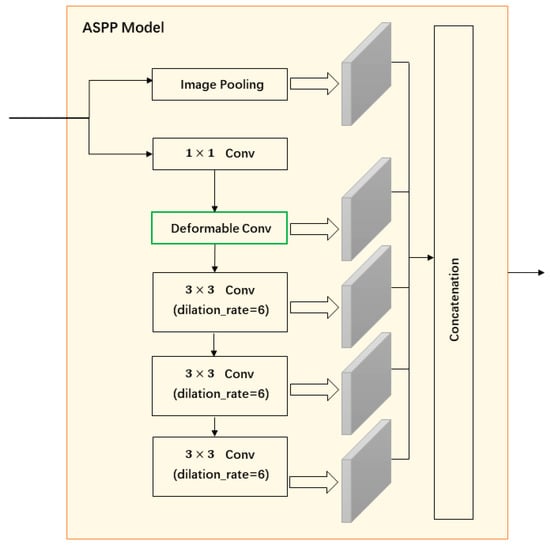 In this research, Deeplabv3+ is utilized to interpret the features extracted by the encoder. Deeplabv3+ is a semantic segmentation model that relies on dilated convolutions. By adjusting dilation factors, it can create receptive fields of various scales to effectively capture multi-scale information. This model demonstrates strong feature extraction capabilities, which assist the network in discerning distinctions between water bodies and their surroundings. Notably, it is proficient in recovering intricate boundary details of targets. Furthermore, deformable convolutions are integrated into the ASPP module to enhance water feature extraction in the advanced feature layer. The internal configuration of the ASPP is depicted in Figure 4.