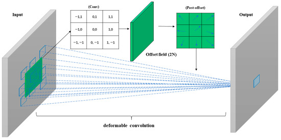 First, we define a standard convolution kernel R, denoted as the weighted sum of sampling values, obtaining Equation (1). Then, a standard convolution feature matrix can be obtained as shown in Equation (2). Finally, an offset is introduced into R to realize the offset of feature points. The value of is shown in Equation (3), and the eigenmatrix of the deformable convolution kernel is obtained as shown in Equation (4).