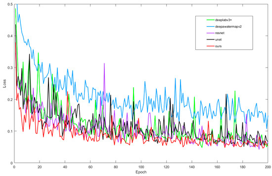 To assess the efficacy of the suggested model, a comparative analysis was conducted against four established methodologies: U-Net, ResNet [33], DeepLabv3+, and DeepWaterMapv2 [34]. We illustrate the variations in loss functions of these methods in Figure 6. The following provides comprehensive explanations of these methodologies: