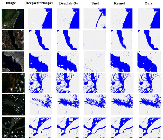 Through a comparative analysis of the four metrics, it was determined that our model exhibited the highest level of accuracy when compared to all other methods. This suggests that our model possesses superior predictive capabilities for delineating surface water and is more effective in extracting water bodies from remote sensing imagery. Furthermore, in comparison to alternative methods, our model also demonstrated the highest recall rate, signifying its ability to identify a greater number of water pixels during surface water mapping while minimizing the omission of water pixels.