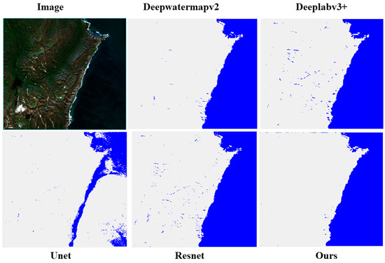 Upon analyzing Table 2, it was observed that ResNet attained an F1 score of 92.68% in the test, surpassing our proposed model by 0.35%. This result suggests that ResNet exhibits superior overall performance. However, its recall rate of 88.96% implies that a significant number of water pixels may be overlooked during extraction, revealing a notable deficiency in accurately delineating water bodies. In contrast, DeepWaterMapv2 demonstrated a precision level of 99.07%, albeit with a lower recall rate of 91.89%. This trade-off indicates that the DeepWaterMapv2 approach prioritizes precision over recall in model predictions, highlighting the potential for enhancing the precise extraction of water bodies.
