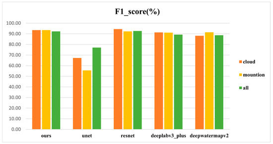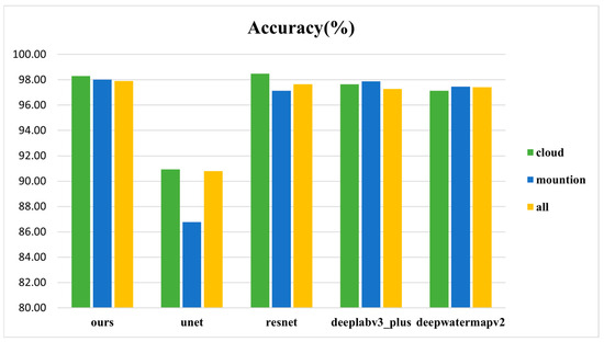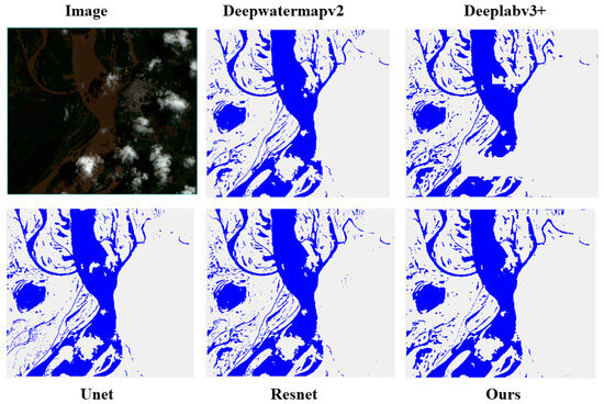 The model attained an accuracy and F1 score of 98.30% and 93.46%, correspondingly, in overcast regions. In comparison to the top-performing ResNet model, the discrepancies are merely 0.19% and 1%, respectively. In contrast to alternative approaches, our recall stands at the highest rate of 92.22%, suggesting that in the prediction of overcast regions, we compromised some accuracy to minimize the exclusion of water pixels, facilitating precise delineation of water bodies. This is further supported by our predicted images. Furthermore, upon juxtaposing the annotated image with the predicted one, we noted that our model demonstrates greater consistency in delineating the boundaries of small water bodies. This implies that our study offers specific benefits in enhancing the processing of small water bodies.